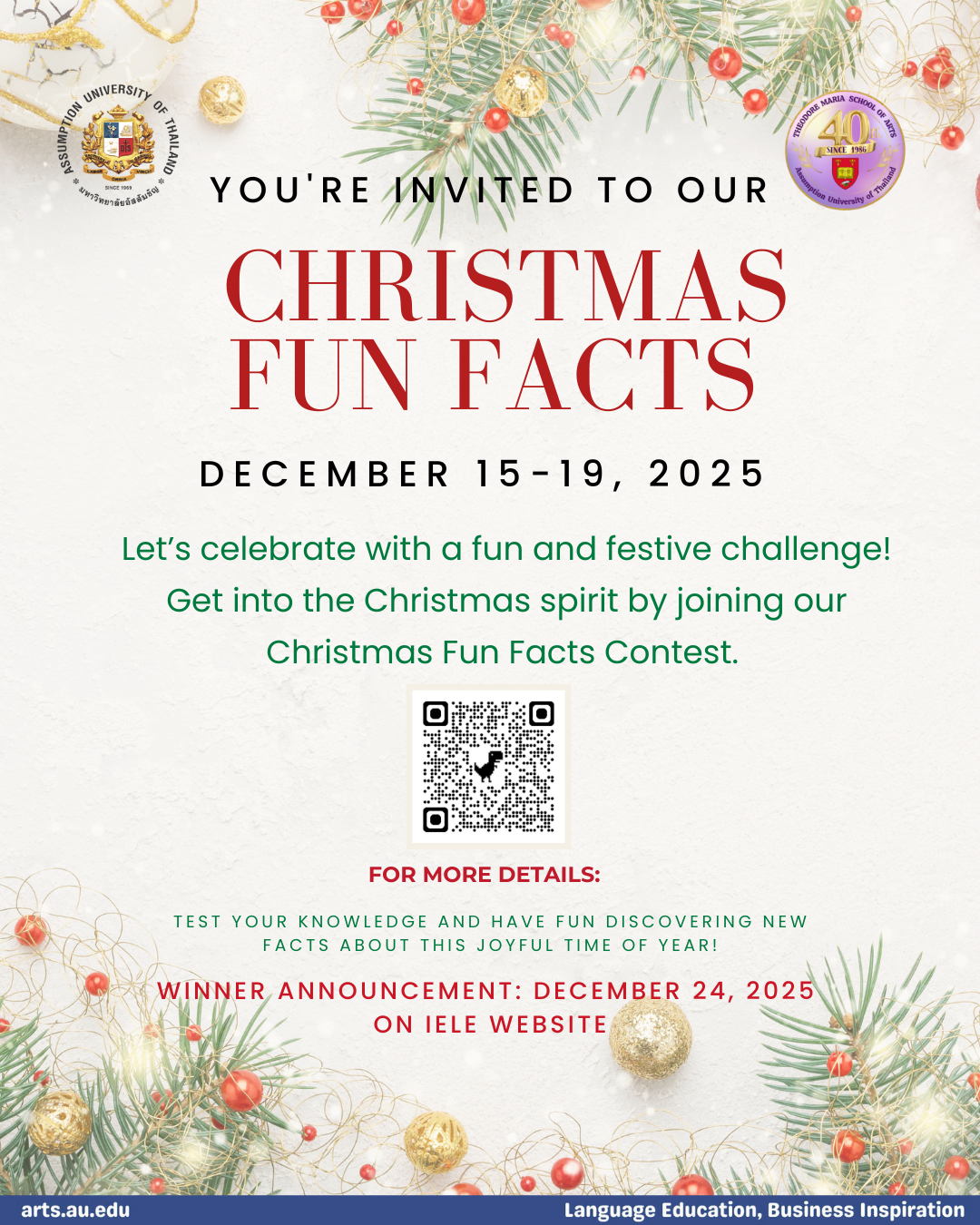 The Institute for English Language Education (IELE), Assumption University of Thailand, organized the IELE Christmas Fun Facts Contest from December 15–19, 2025, inviting students to celebrate the festive season through a fun and engaging knowledge challenge.