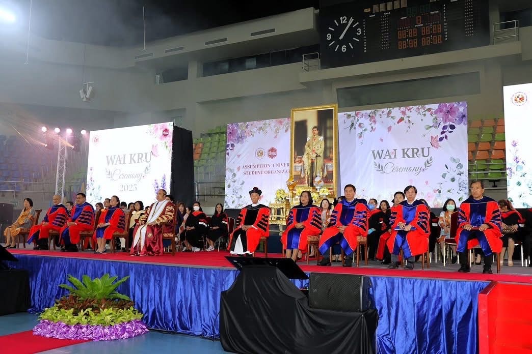 On July 17, 2025, the Assumption University of Thailand (AU)’ s community came together in the spirit of gratitude and tradition to celebrate the annual Wai Kru Ceremony, held at the John Paul II Sports Center, Suvarnabhumi Campus. With doors opening at 12:00 noon and the ceremony running from 13:00 to 16:00 hrs, the event welcomed students in full uniform for a heartfelt tribute to the educators who guide and shape their academic journey.