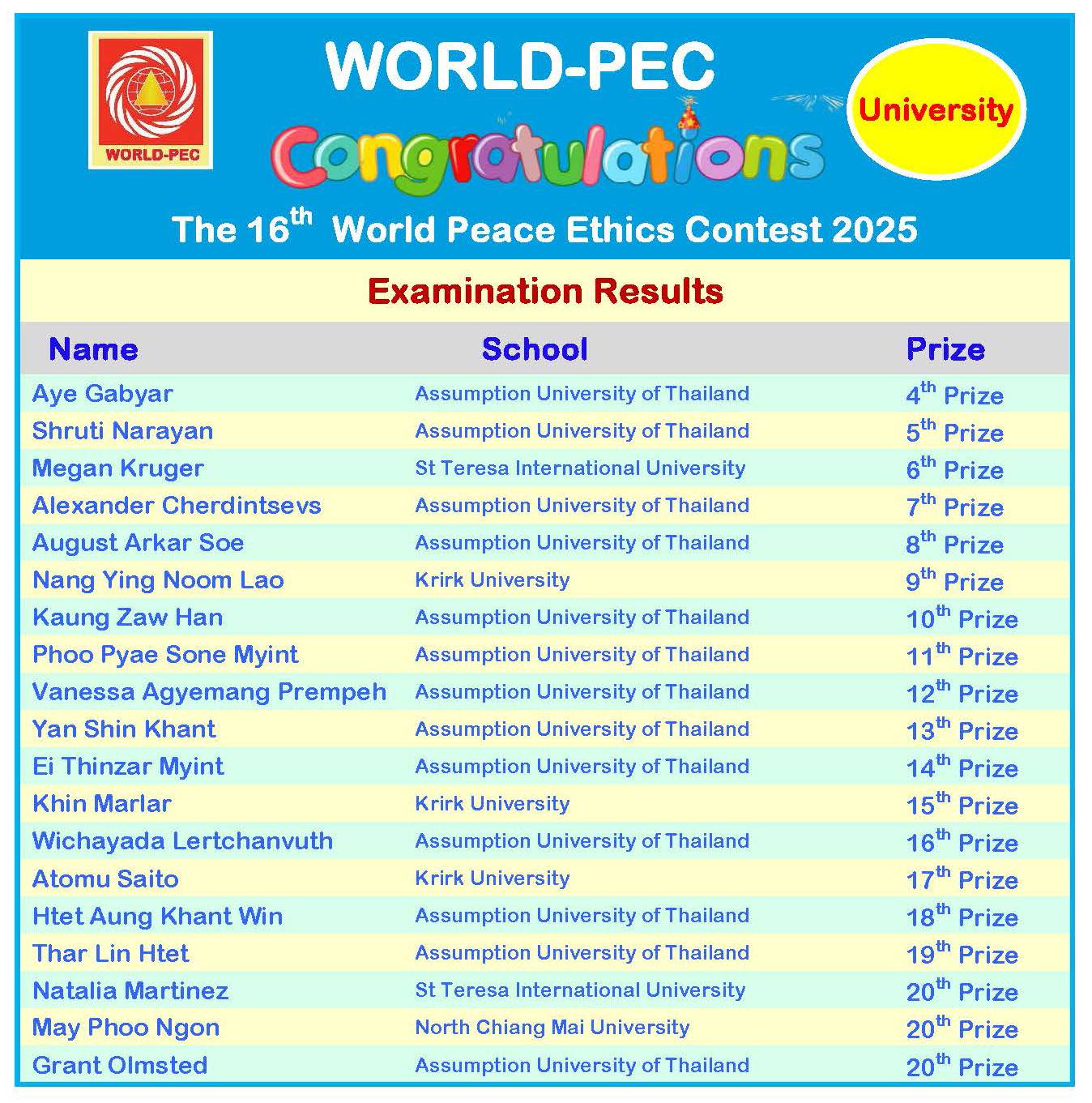 Congratulations to the Winners of the 16th World Peace Ethics Contest (WORLD-PEC) University 2025!